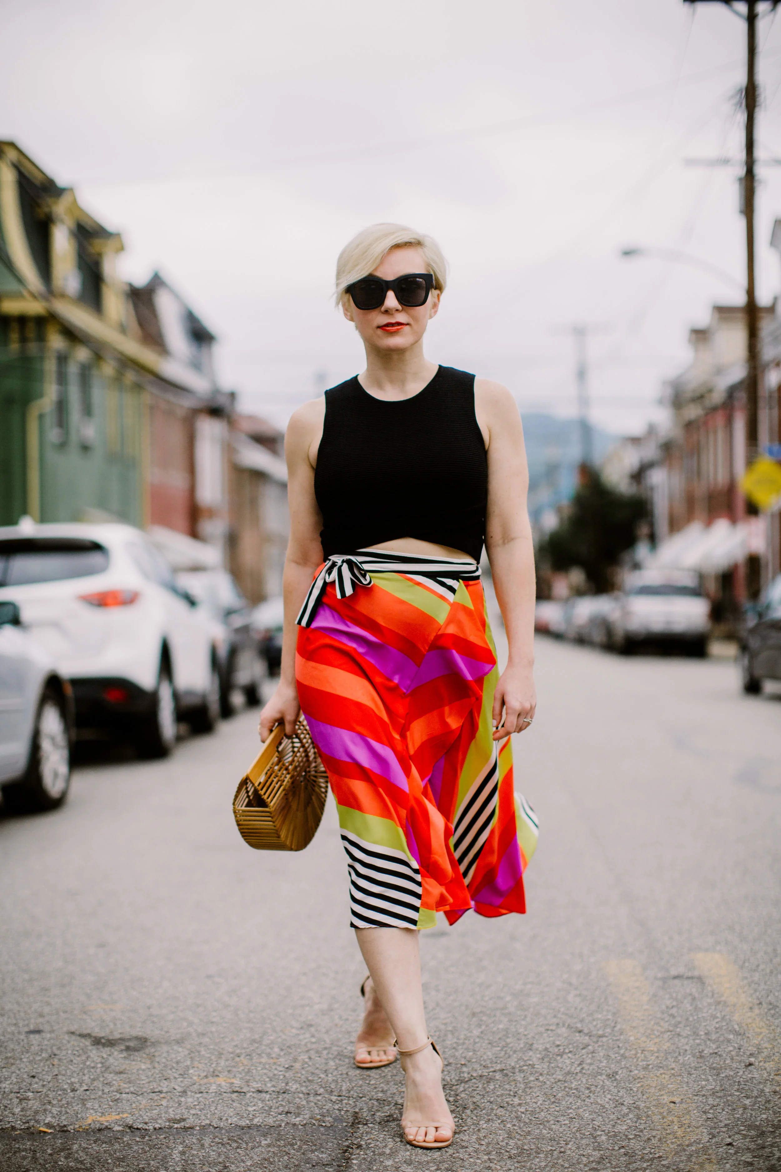 Skirt Anthropologie (it's all gone! love this and this) // Crop tank Modern Citizen (similar) // Shoes Stuart Weitzman // Bag Cult Gaia // Sunglasses Quay