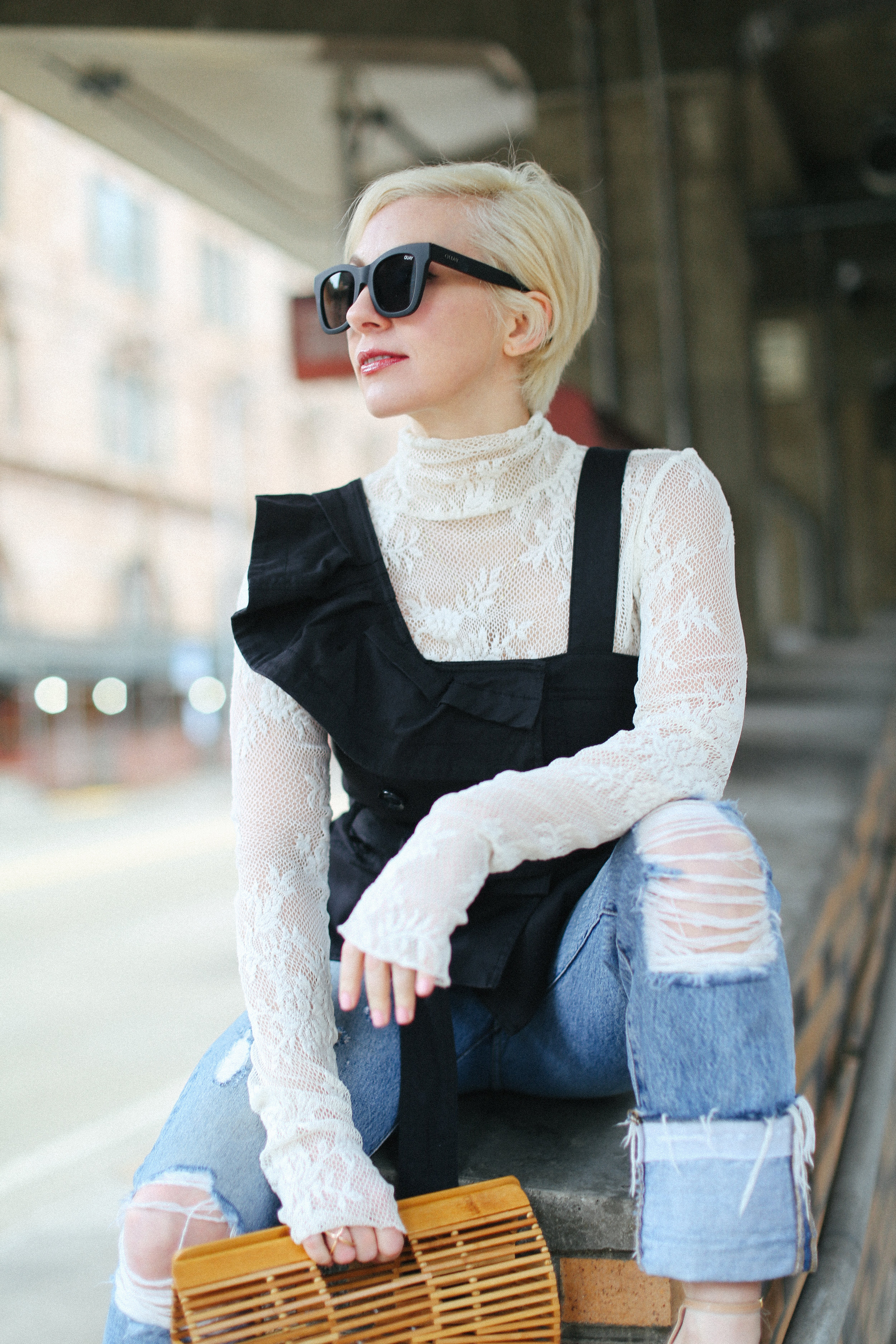 Vest Marissa Webb (I don't know how but, still available at 65% off here!) // Lace top Free People // Denim AYR // Shoes Stuart Weitzman // Bag Cult Gaia // Sunglasses